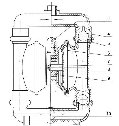 1 进气口 2 配气阀体 3 配气阀 4 圆球 5 球座 6 隔膜 7 连杆 8 连杆铜套 9 中间支架 10 泵进口 11 排气口
